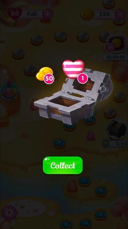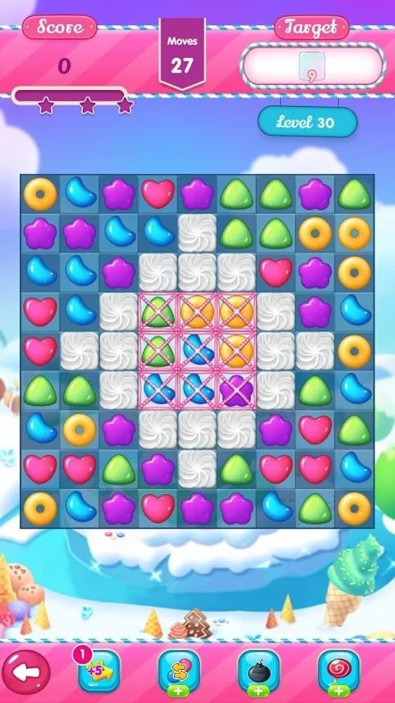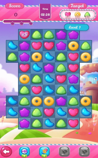 3、交换并匹配3个或以上相同的糖果来进行压碎爆炸,这样你会得到分数,完成关卡获得星星;
