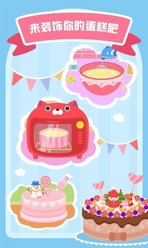 【丰富场景】精心制作游戏画面,不同的甜品拥有各自独特的成品模型,每一个萌宝都可以制作出不同类别样子的甜品啦;