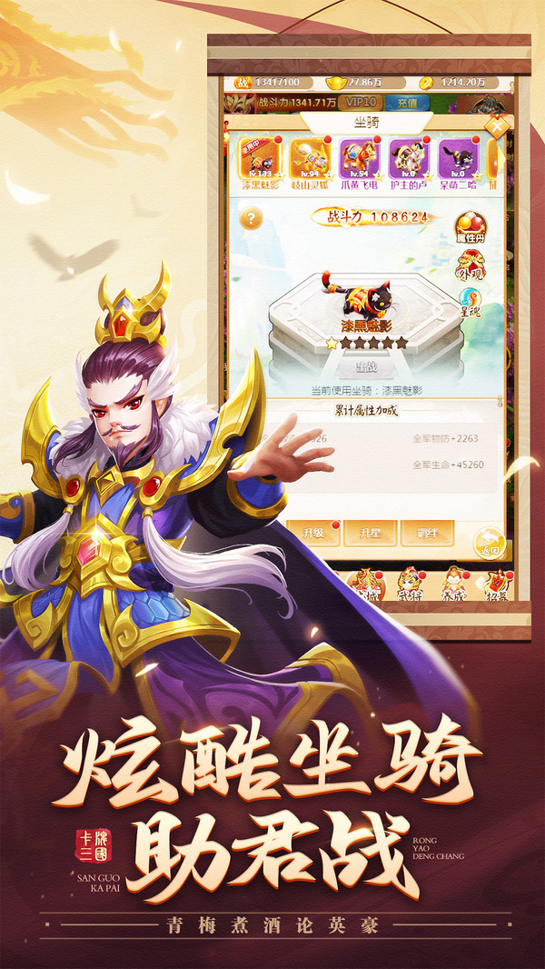 2021超爽三国卡牌游戏《太阁群英传》震撼来袭!少年三国名将养成,超多阵容组合方式,烧脑策略。一键返还武将培养资源,零氪微肝也能轻松推图。同时游戏拥有多元玩法,主线剧情伴随副本任务,爆率超高!精美立绘 酷炫特效赵云马超一枪穿云,吕布貂蝉无双连击,卧龙凤雏攻城为下,攻心为上。炸裂逆天的合击绝技,华丽无双的碎屏特效!精兵强将 多元阵容阵容全面升级,不同阵营,自由上阵!超百位三国名将,数十种阵容搭配方式:一刀流、回复流、反伤流...尽享回合对战、策略博弈一键继承 轻松养成重复培养武将会极大消耗资源,这个问题不再有!一键返还培养资源,无损继承。轻松搭配不同流派阵容应对不一样的挑战!海量福利,零氪微肝超高福利爽翻天,超值豪礼天天送!现在注册就送十连抽。完成剧情任务更有少年虎将相送,还在等什么,快来领取吧!