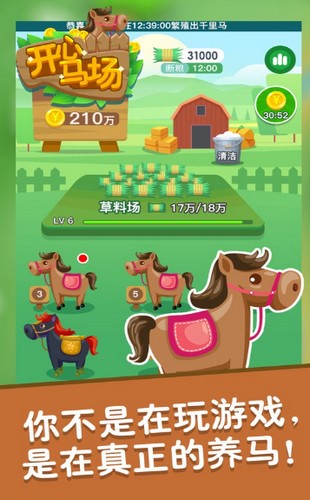 开心马场是一款可以赚钱的经营养成游戏。只需要简单的操作就可以进行骏马的养成,玩家将可以通过自己的马场发家致富。只需要控制好喂养的时间及时上线进行游戏就可以了,不需要太多的操作或者太多的精力,养成千里马是每个马场玩家的目标。