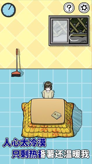 【拿起屋内的扫帚】,来到【右边的后院】,咦!天色好暗…不要紧开始工作吧!从【右下角的绿色树叶堆里】翻出【生红薯】,点击一旁的【大树】,摇下来【一地叶子】,【用扫帚把树叶扫在一起】,【把生红薯放进去】,接下来就是想办法生活烤红薯了!看到屋檐下的冰棱和树下的晴天娃娃,有什么想法没?对了!凸透镜聚焦取火!【用扫帚打下屋檐下的冰棱,并拾取】,【捡起地上的晴天娃娃挂在屋檐下】,天晴啦!【把冰棱放在树叶堆上,不一会儿点燃树叶】,得到香喷喷的烤红薯,拿给屋内的姐姐。搞定啦!