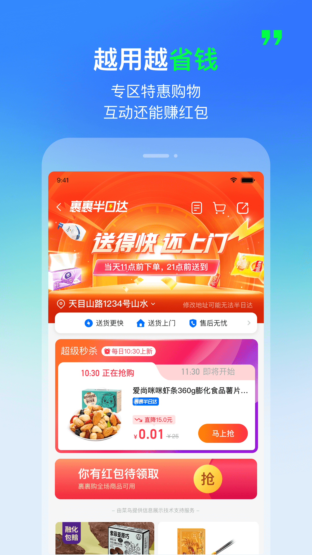 轻松寄件:足不出户就能轻松寄包裹,一键呼叫快递员,2小时上门服务;同时支持淘宝、天猫、闲鱼运费险商品免费退货,购物达人们从此任性买无忧退。