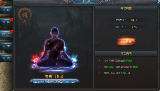 内功类似于一个护盾,可以抵消一部分玩家所受到的伤害,同时,内力值具有上限,随时间自行回复。减伤越高,内力可以抵消的伤害越多。内力值可以通过打怪获得,内功经验可一直累积,经验条满后需要手动点击升级按钮进行提升。