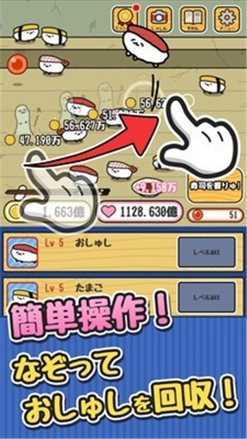 1、可以采取轻松放置的游戏方式,不用任何操作,寿司就自己长出来了。