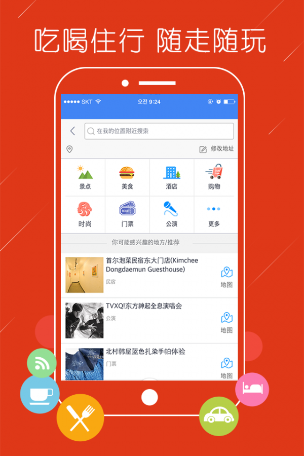 韩游地图可查询附近的酒店、美食、景点、公演、购物店等,一键使用韩国优惠券,方便又省钱。APP实时推荐周边吃喝玩乐,方便您的韩国旅行