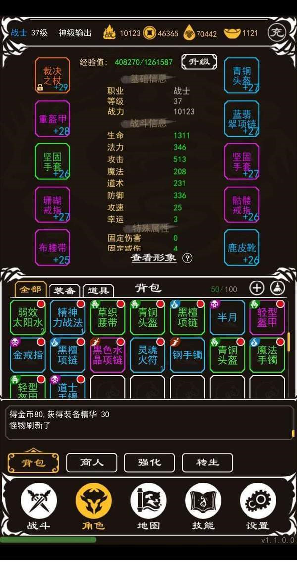 2、平民传奇文字版游戏套装系统完善,超高爆率击杀野怪,收集所有的套装属性,提升你的战斗力吧。